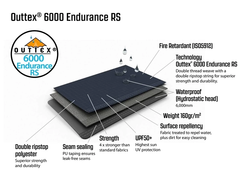 - Flysheet: Outtex® 6000 Endurance RS, 100% polyester