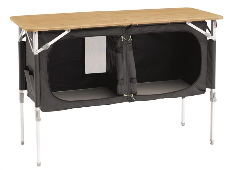 Adding practical convenience and storage solutions for family tent living, the OutwellÂź Kitchen Table Range includes a wide range of sturdy options. Easy to set up, all the versatile designs offer durable, stable surfaces to prepare meals safely. Padres designs have solid bamboo table tops, some with a windshield, and include a storage/table model with a working height side unit and windshield. The small packed size of Padres Double offers two cupboards under a large worktop. Samos and Andros designs are made from durable embossed polyester fabric with zip doors under the table tops. Our magnetclosed door kitchen table range uses mesh screens at front and rear of the cabinets to ensure 100% bug-free storage with ventilation.
